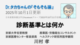川村孝先生の日本産業保健法学会Facebookグループへの2023年10月11日の投稿のアーカイブです。 診断基準とは何か231011
