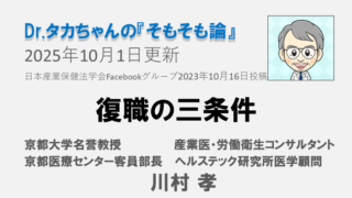 川村孝先生の日本産業保健法学会Facebookグループへの2023年10月16日の投稿のアーカイブです。 復職の三条件231016